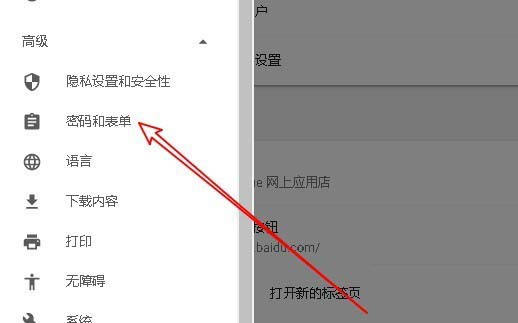 4、接下来我们点击高级展开菜单中的“密码和表单”菜单项。