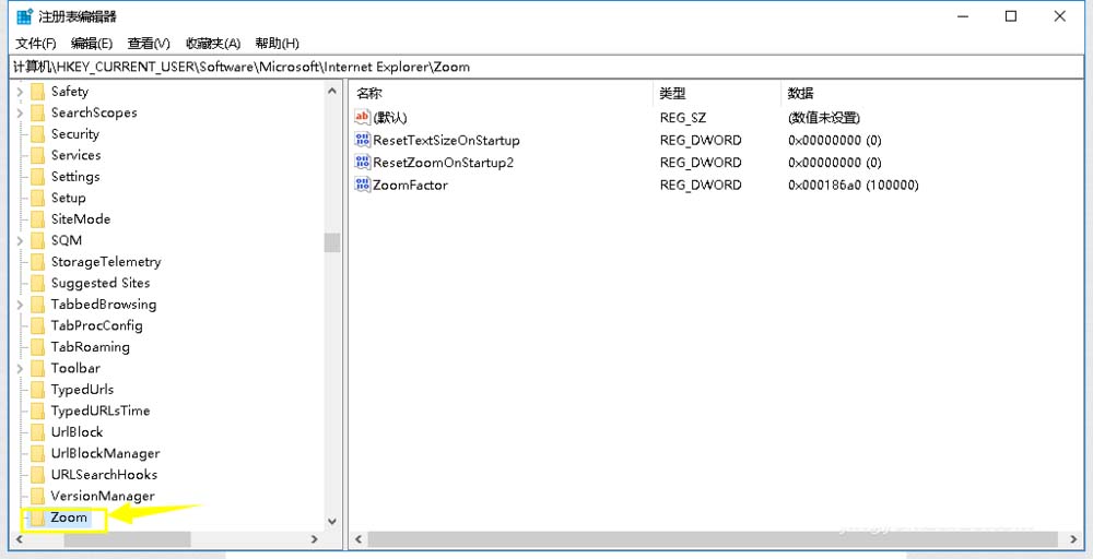 4、进入注册表,按下列路径进入,HKEY_CURRENT_USER\Software\Microsoft\Internet Explorer\Zoom,如下图所示
