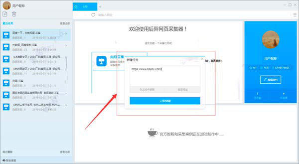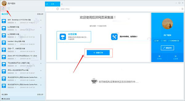 1)启动后羿采集器,进入主界面,点击创建任务按钮创建 "向导采集任务"
