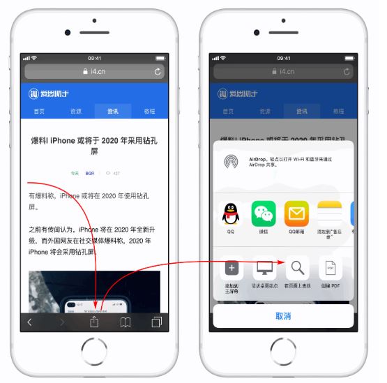 打开Safari浏览器,进入某一网页,点击下方“分享”按钮调出工具栏,选择“在页面上查找”