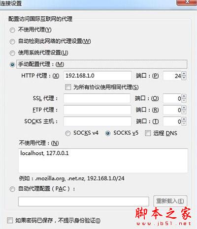 最后我们选择手动配置代理,输入可用的代理IP地址和端口。比如.mozilla.org,.net.nz,192.168.1.0:24