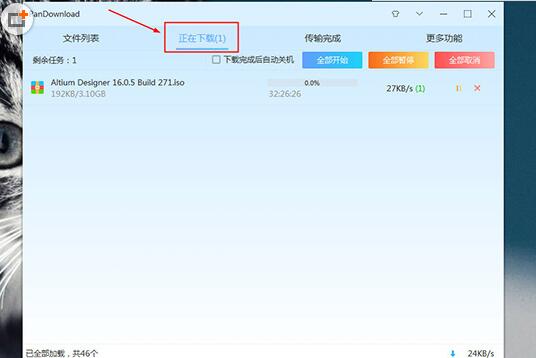 4、大家可以在“正在下载”中找到正在下载的文件,在文件的下方有下载时间可供参考,不过PanDownload会因为资源的不同导致下载速度发生变化,所以需要用户自己寻找合适的资源,现在有一款下载神器摆在面前却不好好珍惜,等之后失去了回过头来想想可能是后悔莫及,赶快来试试传说中的“网盘下载神器”吧,如下图所示: