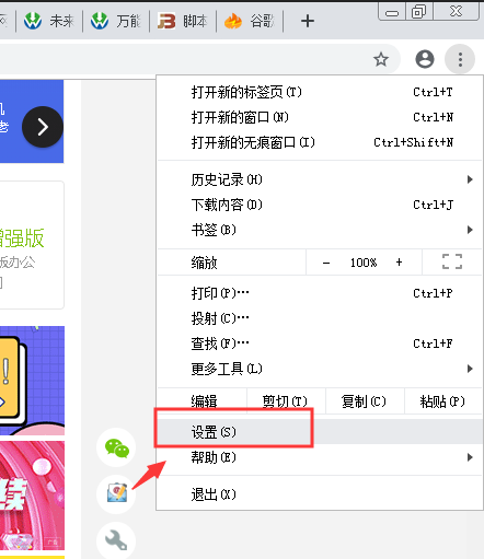 1、打开谷歌浏览器,点击右上角的菜单按钮打开菜单,选择“设置”;