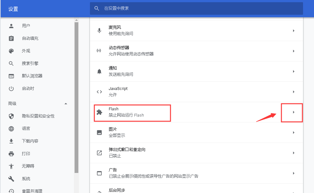 或者,你可以直接在地址栏输入chrome://settings/content,找到并点击【Flash】选项,