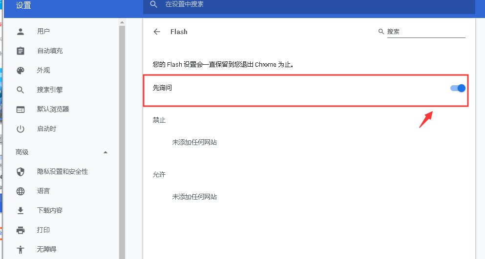 进入界面,点击【禁止网站运行Flash】,系统默认是关闭的,将其打开,即可解决问题。