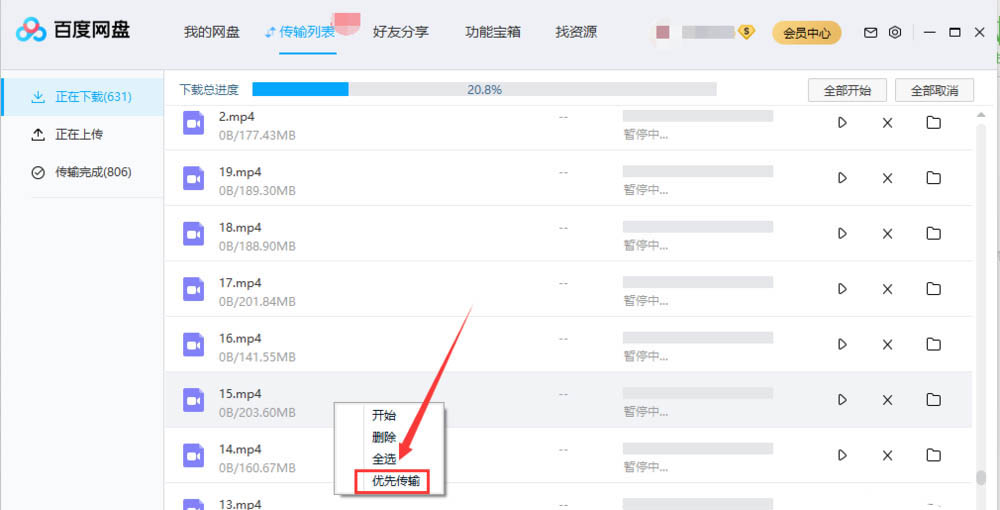 4、右单击文件弹出菜单栏后单击“优先传输”即可。