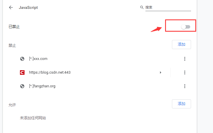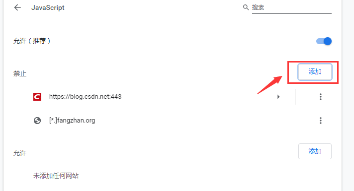 不过如果我们只想屏蔽部分网站的js,那么就可以将上面的 允许 打开,通过下面的禁止选项禁止操作添加即可。