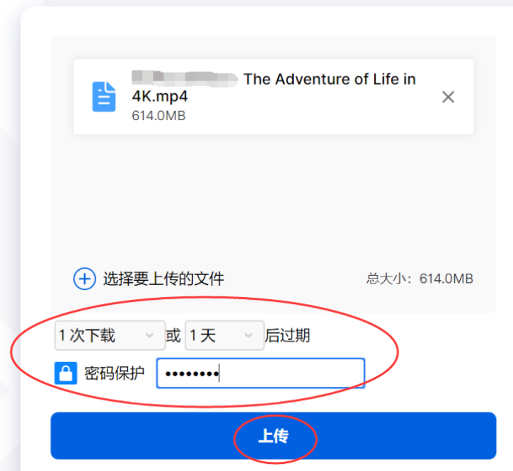 2、在跳转的页面中,设置好文件可下载的次数和有效期,也可以设置密码保护;然后点击【上传】。