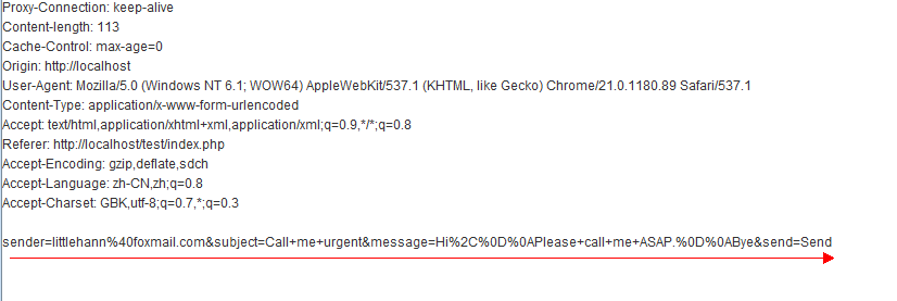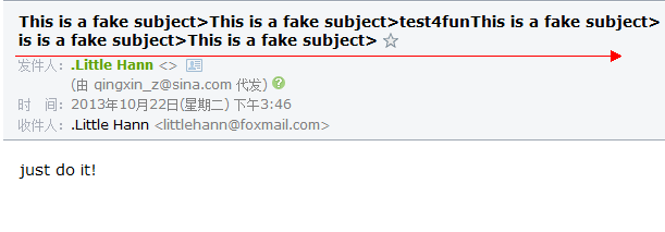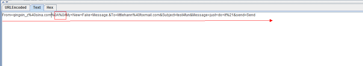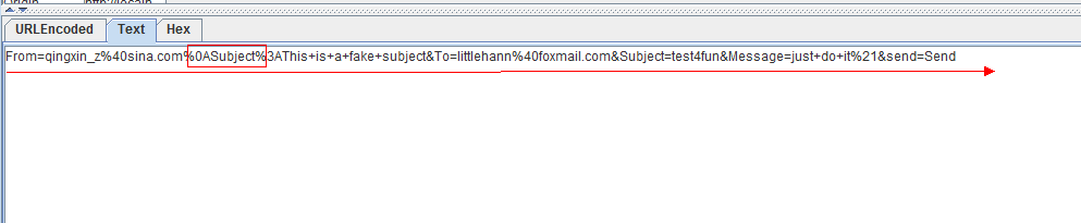 这里要注意的的,SMTP区分消息头部和消息主题是依据%0A%0A双换行符决定的。