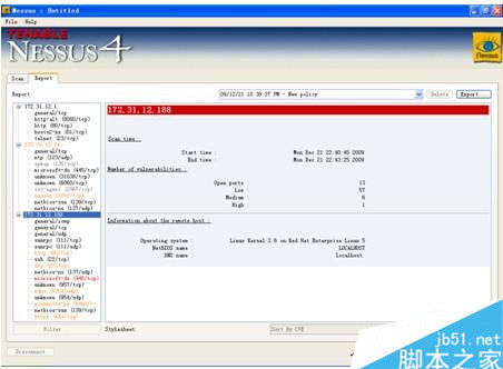 (4)扫描的整体效果:如图4所示,扫描给出了对172.31.12.188这台主机(Linux操作系统,RHEL 5.0版本)的扫描结果,可以很清晰看出操作系统的版本以及开放的端口,同时,也能够将开放的端口详细信息列出来。