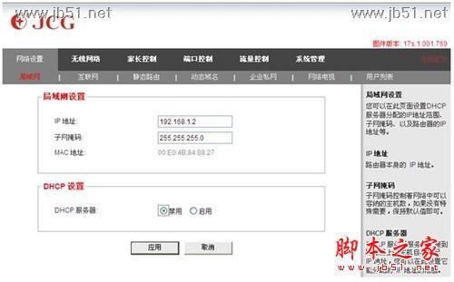 最后,网络设置—局域网—局域网设置(IP地址选择与主路由器在同一网段, IP地址可以不同;如:主路由的IP地址为192.168.1.1,那么次路由的IP地址应该为192.168.1.(2—255))--DHCP设置—选择“禁用”,然后点击“应用”如下图:
