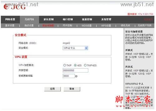 其次,无线网络—安全与加密(记住该路由器的:安全模式、加密算法、共享密钥(密码))如下图: