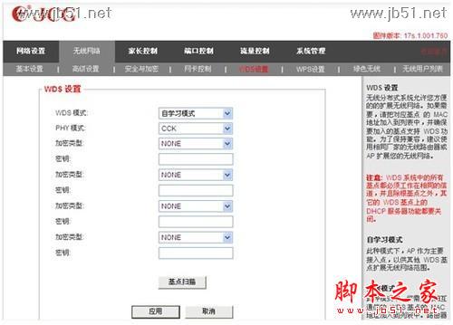 再次,无线网络—WDS设置(记住该路由器的:WDS模式—选择“自学习模式”),如下图: