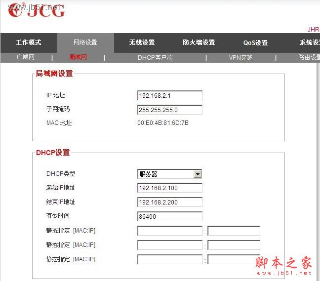 网络设置——局域网(“IP地址”这里要设置成和第一台路由器不一样的网段。如:第一台路由器局域网的IP地址为192.168.1.1。那么第二台路由器的IP地址应改成192.168.2.1)