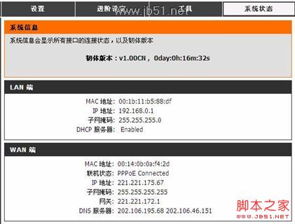 在系统状态界面中看到PPPoE已经连接上,且路由器的WAN端也获取到了由电信部门分配的IP地址信息。