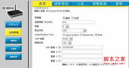 3.检查无线是否有做加密,建议将加密方式设置成WEP。(在“首页”→“无线网络”→“安全方式”,选择WEP)