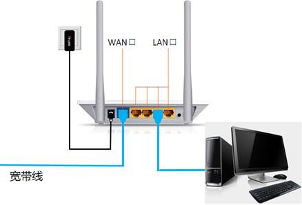 如下图所示,电脑网线连接路由器LAN1~4中其中之一,路由器电源通电,查看并确认各个指示灯状态正常。