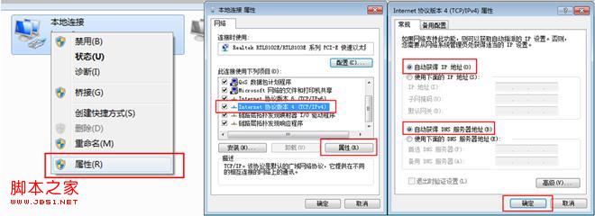 Windows 7/Vista系统:点击桌面右下角的网络连接图标 ,依次点击“打开网络和共享中心--更改适配器设置/管理网络连接--右击本地连接--属性”(或者点击“开始按钮--控制面板--网络和Internet--网络和共享中心--更改适配器设置/管理网络连接--右击本地连接--属性”) ,然后按照下图配置即可。