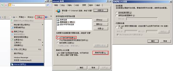 打开IE浏览器,依次点击“工具——Internet选项”选择“连接”选项卡,选择“从不进行拨号连接”后点击“局域网设置”,确保三个选项均未勾选,如下图所示,并点击“确定”,回到上一个Internet选项对话框,点击“确定”。