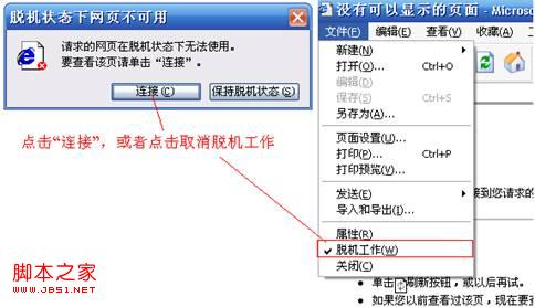 关闭脱机状态,脱机状态下会影响正常浏览网页。在弹出“脱机状态下网页不可用”提示下选择连接,或者点击浏览器“文件——脱机工作”,不勾选脱机工作。