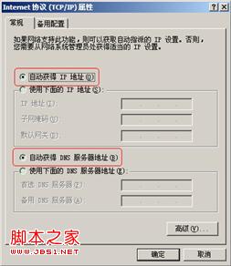 4.控制面板→网络连接→本地连接→右键属性,双击Internet协议(TCP/IP)进入,把IP和DNS都选为自动获取,确定保存。如下图: