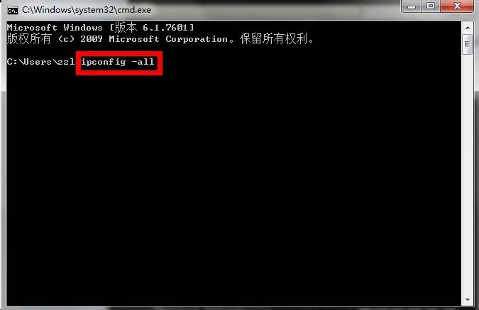 2、出现“命令提示符”对话框,输入“ipconfig -all”命令后回车!