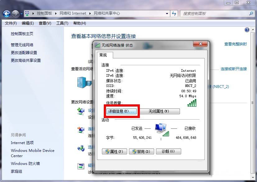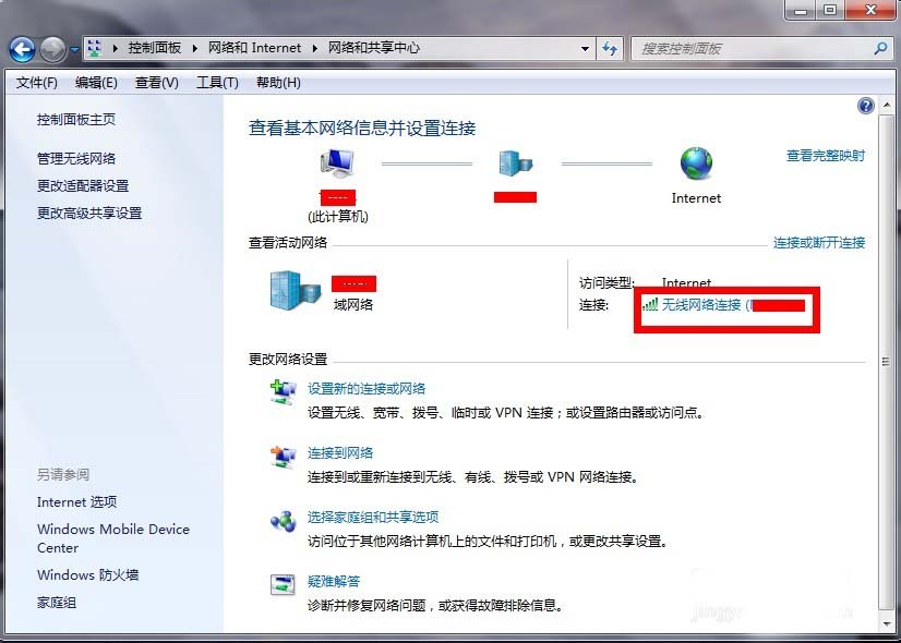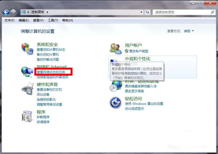 在控制面板上的选择“网络和internet”选项下的“查看网络状态和任务”