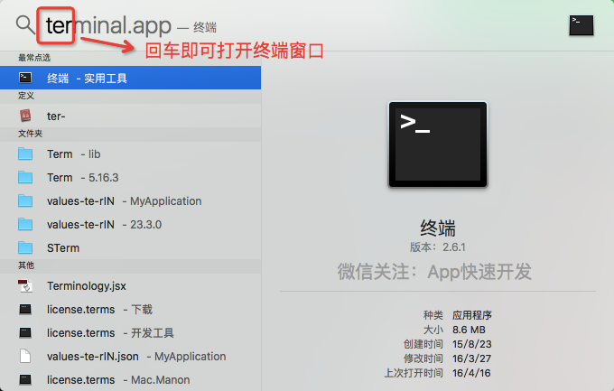 在英文输入法的状态下,按键盘“Ctrl + 空格”组合键,调出Spotlight搜索,在这里可以快速启动终端,输入ter,然后回车,即可打开终端: