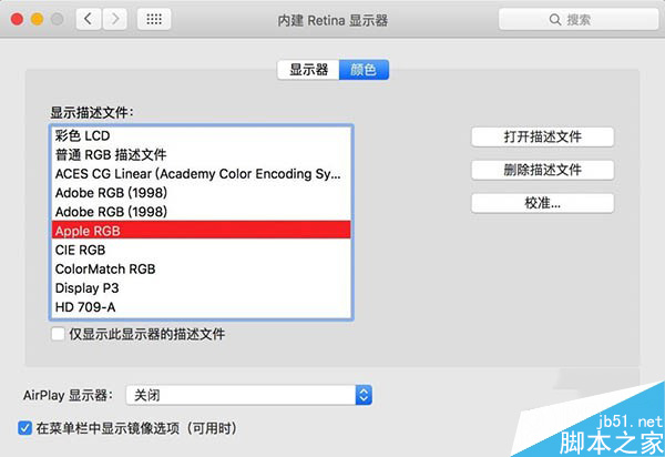 第二步:在“显示描述文件”列表下选择任意一个,比如AppleRGB,然后点击“校准”。