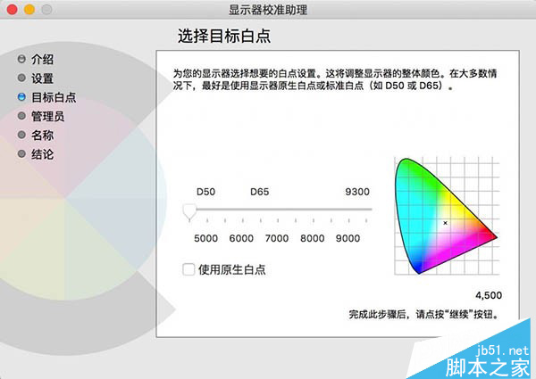 第三步:在弹出的“显示器校准助理”界面中选择“目标白点”,并且取消勾选“使用原生白点”,然后拉动上面的滑块,越往左边屏幕越黄,保存你的描述文件即可。