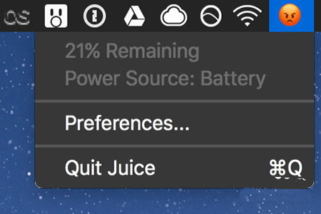 首先我们需要下载一款叫 Juice 的小插件应用。Juice 会用 Emoji 表情来显示剩余电量的多少,每 10% 就更换一个表情,还是挺有趣的。默认是一套淡定到愤怒的表情,Juice 中还有其他几套表情让你选择。点击「Preferences」后在「Current Scale」中选择即刻。