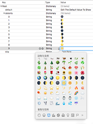 如果你觉得还不够好玩,那还可以自己来编辑一套表情。点击「Preferences」界面右下角的「Add Scale」,然后会在 Xcode 中打开一个面板,你只需要在右边的「Vaule」中输入各种 Emoji 表情,然后再在「title」的「Value」里起一个名字,保存即可。使用「control + command + 空格」就可以快速唤出 Emoji 表情面板。