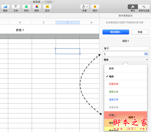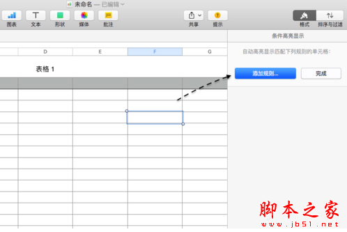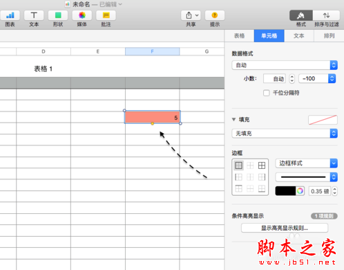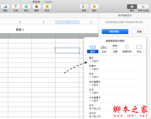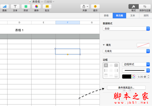 1、有时候在表格中可能会需要用到让 Numbers 自动根据条件来判断是否要填充的需要。同样地,先选中一个单元格,然后在【单元格】栏目下点击【条件高亮显示】选项,如图所示