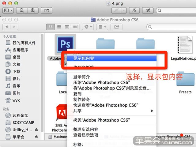 5、在“应用程序”文件夹,找到Adobe Photoshop CS6文件夹,在里面找到Adobe Photoshop CS6.app,右键,选择“显示包内容”,如下图所示: