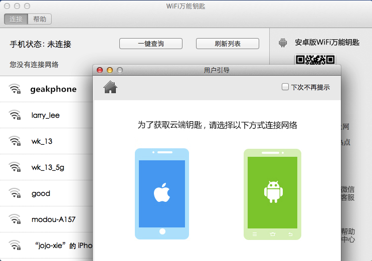 1. 查询热点、获取云端密码,需要使用网络,电脑无可用网络时会提醒连接手机共享网络,用户可以根据界面提示进行连接。