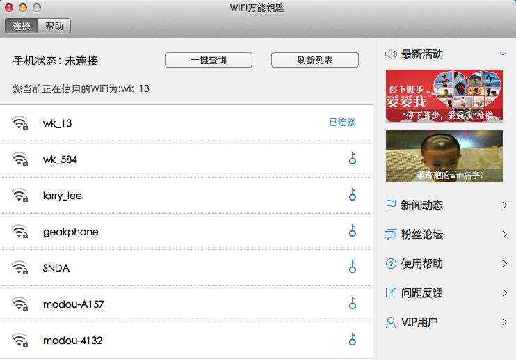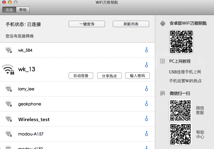 2. 连接上手机后,点击“一键查询”,查找附近可用的WiFi热点。已被分享的热点会显示有蓝色钥匙的标志。