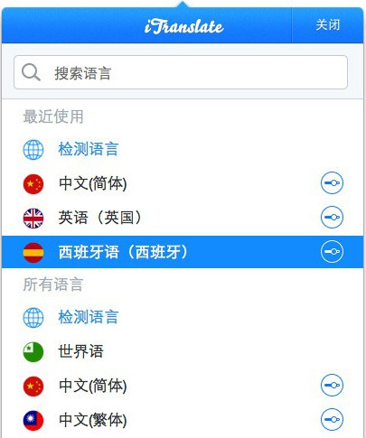 由于 iTranslate 支持80多种语言,所以搜索功能非常方便。每种语言左侧都有国旗图标,让我们可以更直观的选择。此外,最近使用的语言会显示在顶部,方便再次使用。大家可以看到某些语言右侧有设置小图标,这意味着这种语言可以进行文字朗读,点击小图标后可以选择男声或女生,并对语言速度进行调整正。