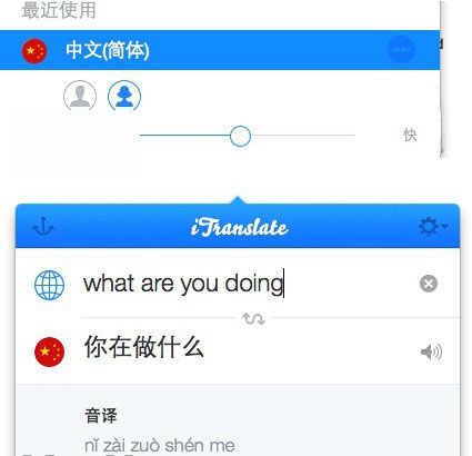 启动后的 iTranslate 在菜单栏显示一个地球经纬度的小图标。点击小图标后可以开启 iTranslate 的主界面,iTranslate 支持中文,作为一款翻译软件,如果不支持中文有些太说不过去了。iTranslate 的界面非常简单,蓝色的标题栏中有 iTranslate 字样,左侧的锚形图标可以固定 iTranslate 的界面,让 iTranslate 一直保持在最顶部。右侧的齿轮图标可以开启设置功能。iTranslate 的主要功能区域,也就是输入文本的白色区域分为两个部分,也就是互相翻译转换的两个语言。点击中间的图标可以将两个语言互换位置,需要注意的是源文本始终在顶部文本框中。点击国旗图标可以进入语言选择界面。