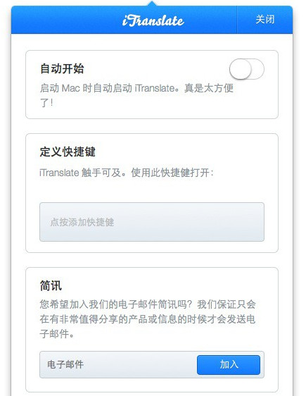 源语言选择自动检测后,可以自动识别输入的语言。每次输入语言后,需要点击回车 Enter 才能开始翻译,不能自动翻译有些说不过去。iTranslate 的设置功能并不多,可以选择是否随开机启动。iTranslate 可以选择快捷键组合,这样在其他应用中也可以通过复制内容,快捷键激活 iTranslate 粘贴并翻译快速操作。想要获得 iTranslate 最新消息的朋友可以在电子邮件中输入地址,加入 iTranslate的消息订阅。