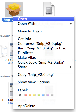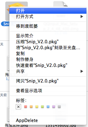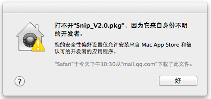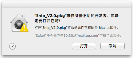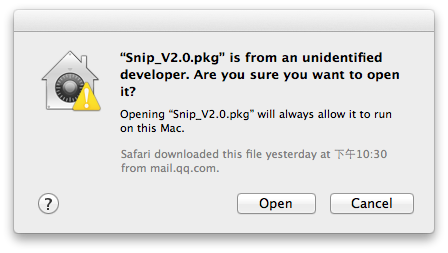 请确认你的操作系统是否为 10.8 或以上版本,是的话请选择 Snip 安装包后右键单击,在右键菜单中选择“打开”,便可进行安装。