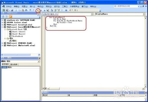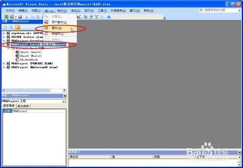 2、在Excel界面上按Alt+F11,进入VBE窗口,在左边“工程”窗口中点选出问题的那个工作簿,然后插入一个模块