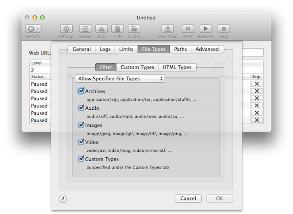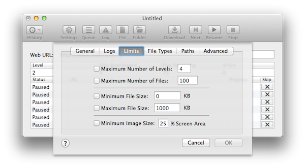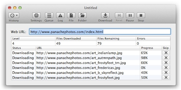 软件操作非常简单,输入网站网址,敲回车就开始下载了,而且自定义设置颇为丰富,如果你在一次Download过程中暂停或停止下载,可以在History菜单里找到记录接着进行下载,下载过程里可以对列表里的文件采取跳过操作。