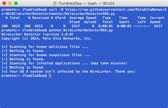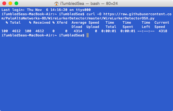 curl -O https://raw.githubusercontent.com/PaloAltoNetworks-BD/WireLurkerDetector/master/WireLurkerDetectorOSX.py