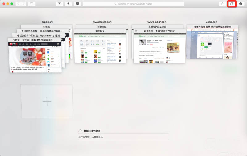 打开标签管理界面,你可以点击图中右上角红框中的按钮,或在 Trackpad 上使用三指收缩的手势。在这个界面上,你可以点击缩略图查看某个网页,或是直接关闭它。最酷的是,当标签页过多时,Safari 还会自动将同一个域名下的页面聚合堆叠在一起。