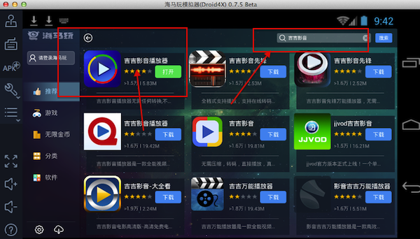 第二步,用户根据提示安装好海马模拟器Mac版,然后打开该软件,在海马玩里面搜索吉吉影音: