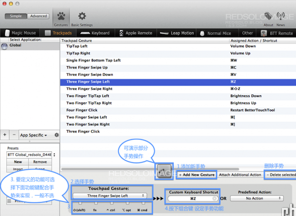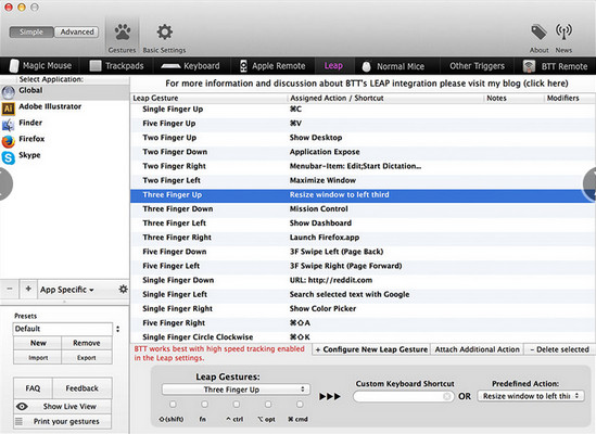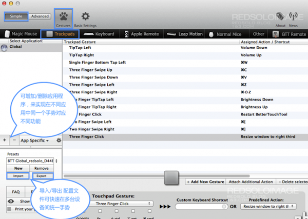 寻觅了很久适合imac的多功能无线鼠标,一无所获。不经意间看到介绍BetterTouchTool的文章,如获至宝。os x对触控板的设置并没有完全发挥出它的潜力,右手能干的事情还可以更多。BetterTouchTool(简称BTT)就是这样一款软件,把触控板的潜力发挥到淋漓尽致。平时使用方面(非游戏),功能上秒杀G700s,即便是20多个功能键的G600也望尘莫及。