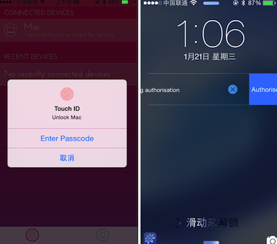 下面来看一下使用 MacID for iOS 在 iPhone 5s 上是如何解锁 Mac 的:
