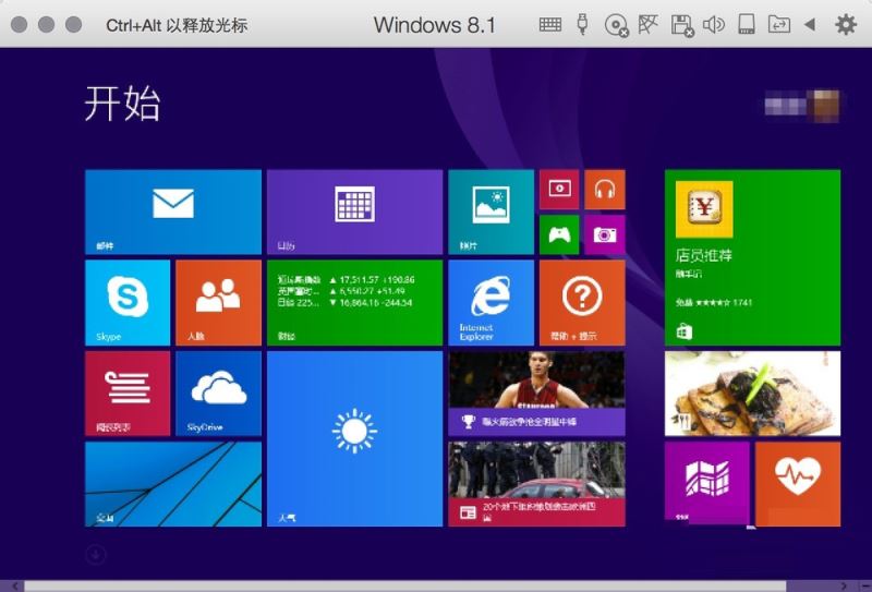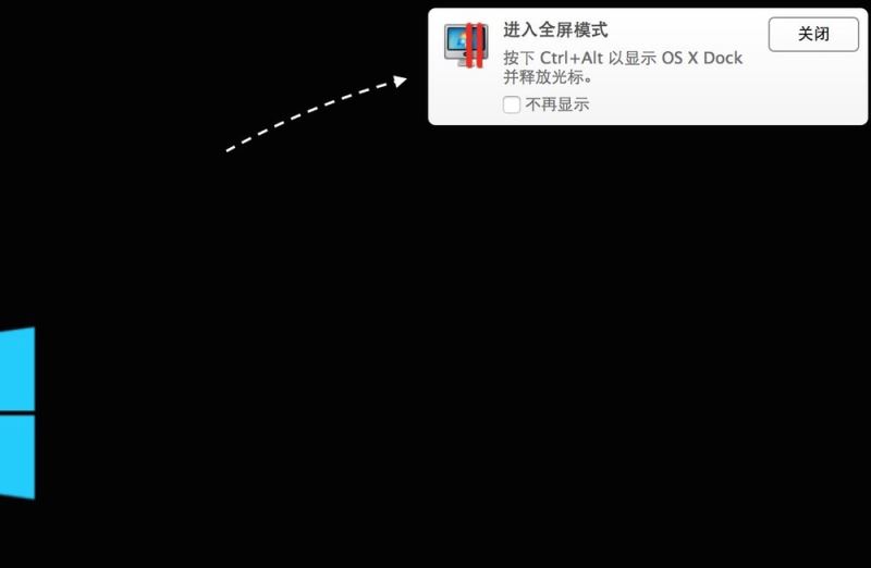 1、之前已经说到,由于 Parallels Desktop 默认是让虚拟机启动以后直接进入全屏模式,在刚一启动时,可以看到屏幕右上角的提示让我们按下“Ctrl+Alt”键为显示 Mac OS 下的 Dock 菜单栏。