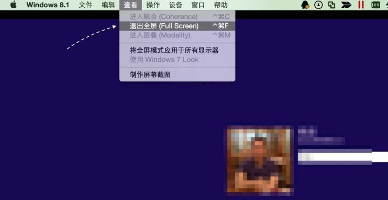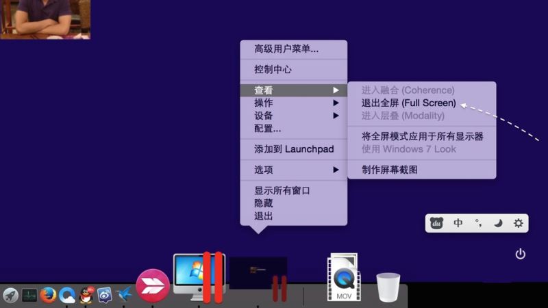 2、当我们按下 Ctrl+Alt 组合键以后,可以在 Dock 栏上右键点击当前正在运行的虚拟机,在“查看”菜单中即可看到“退出全屏”选项,点击即可退出。