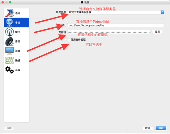 串流类型选择自定义流媒体服务器,下面的URL和流密钥需要根据直播间中的直播信息进行填写,登陆斗鱼账号,点击用户名--->个人中心--->主播相关--->直播设置--->进入直播房间,然后可以看到下图: